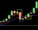 아래의 차트는 이미 마감이 되어 완성이 된 차트입니다. 네모 박스 친 저 캔들이 0초에 딱 시작했을 때의 모습을 상상해 보십쇼. 그 때는 캔들이 그려지기 전이기도 하고. 딱 시작한 시점이기 때문에. "시가" 가격만 찍힌 짧은 - 가로줄이 평균인 4단순평균과 겹쳐있기만 할 겁니다. 오른쪽 네모 안도 마찬가지 상황일 거구요. 바로 그 상황을 인지하기 위함입니다.