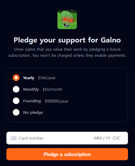 그럼 이런 화면이 뜹니다. 카드결제정보를 입력후 Pledge a subscription 클릭하면 완료.