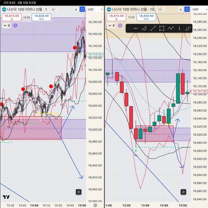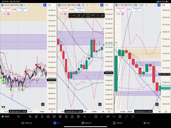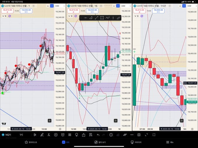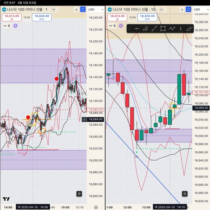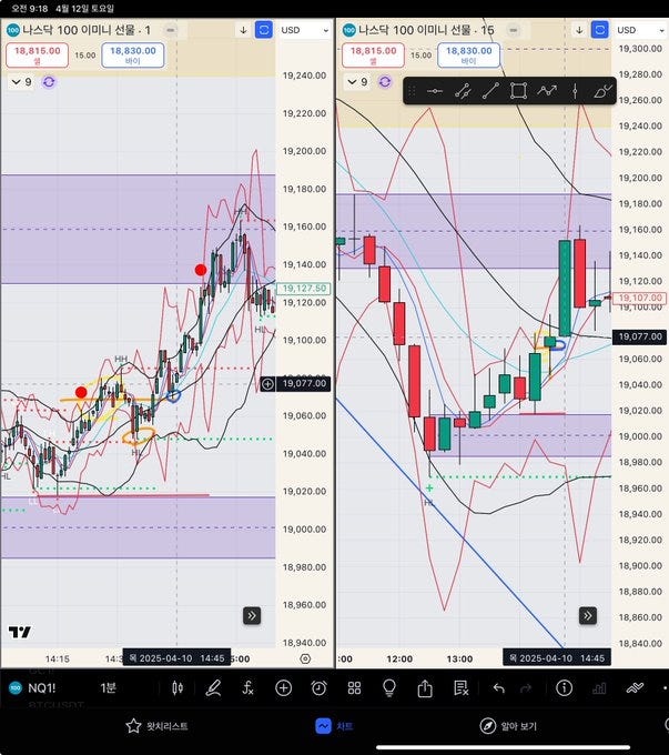 본 교관은. 타임프레임 3개를 동시에 본다고 했습니다. 왼쪽 1분-5분봉 왔다갔다. 가운데 15분봉-1시간봉 왔다갔다. 오른쪽 1시간봉-4시간봉-일봉 왔다갔다. 보통 1분-15분-1시간봉 셋업으로 많이 매매 하지만. 스윙을 하고싶거나. 더 긴 흐름을 볼땐 1시간봉-4시간봉-일봉 혹은 4시간봉-일봉-주봉 봄.