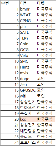 1 bmnr 미국주식 2 WEAT 미국주식 3 CPNG 미국주식 4 pltr 미국주식 5 SATL 미국주식 6 TLRY 미국주식 7 Coin 미국주식 8 OCG 미국주식 9 Velo 미국주식 10 SMCI 미국주식 11 Himz 미국주식 12 mvis 미국주식 13 doge 코인 14 Zen 코인 15 GPUSDC 코인 16 wlfi 코인 17 삼성전기 한국주식 18 한화오션 한국주식 19 녹십자 한국주식 20 kcc 한국주식 21 삼성전기 한국주식 22 대한항공 한국주식 23 플리토 한국주식 24 로보티즈 한국주식