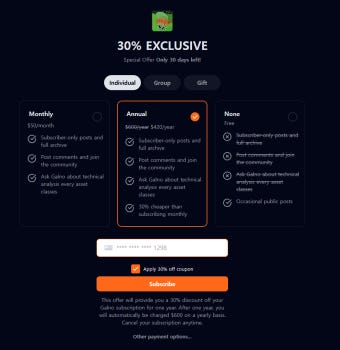 30% 할인된 가격 $420 (월 $35 비용) 으로 연간 구독