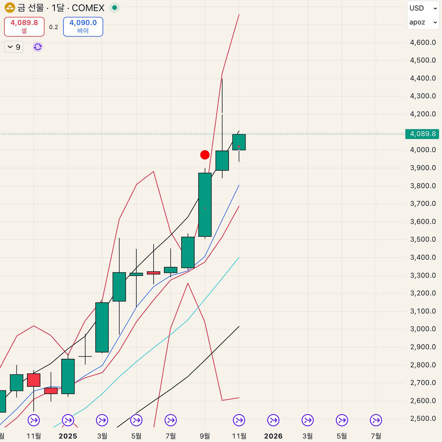 월봉은 저번주 글 포스팅에 작성한 관점과 다르지 않다. 하방 레인지는 3800 4이평 근처까지 열려있기는 하고. 이전 월봉의 윗꼬리가 길긴 하지만 마감을 몸통이 그래도 좀 있는 양봉도지로 해놔서. 그대로 상승랠리 지속으로 보는게 맞는거 같고. 더 쪼개들어간다면 매물대를 옆차기로 만들어주는게 정배라고 했던 기억이 난다. 단. 여기가 골드 신고가 ATH 부근이기 때문에 그대로 말아 올릴 가능성을 늘 염두에 두자.