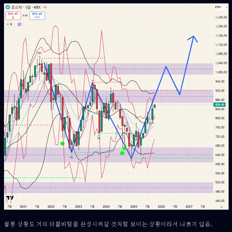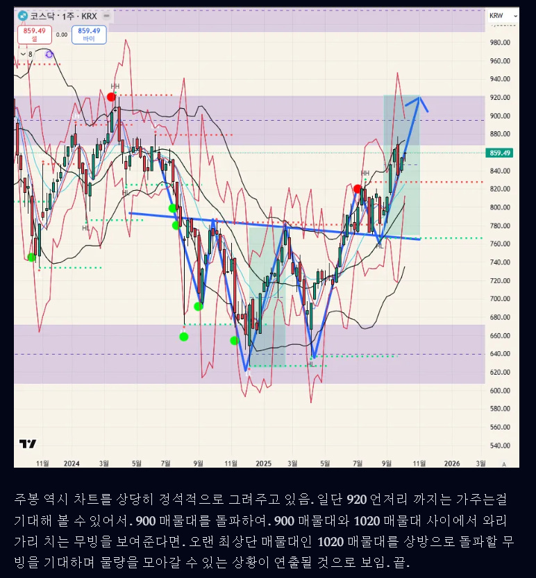 코스닥의 흐름도 테슬라와 다르지 않다. 인간은 너무 오랫동안 같은 가격대의 매물대에서 갇혀서 반복해서 상승과 하락을 경험하면. 사고방식이 그 가격대에 갇혀버린다. 일단 1020 매물대 까지는 일단 도달할 가능성이 높아보임.