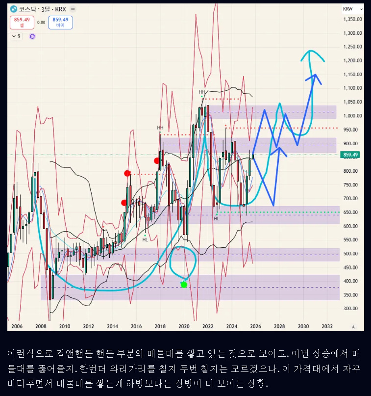 장기적으로 코스닥 차트만 보면. 결국 이렇게 주요 매물대를 계단처럼 딛으면서 한채널씩 올리다가. 20이평의 각도 자체가 달라지는 랠리를 펼치는 타이밍이 나올 수 있는 차트임. 20이평의 각도 자체가 달라지는 랠리.