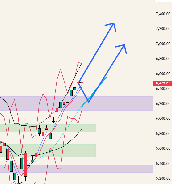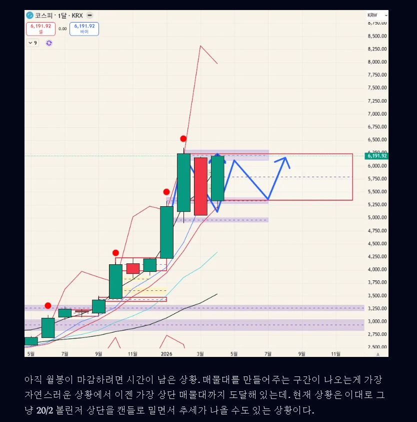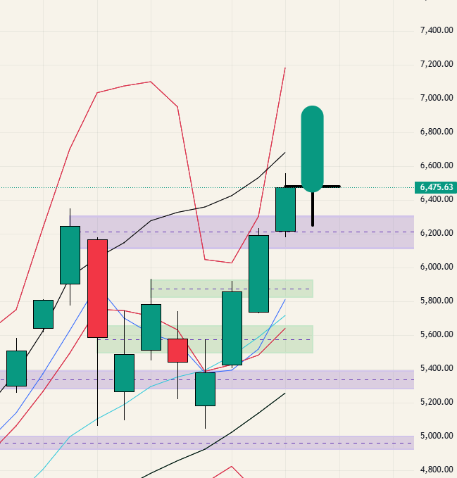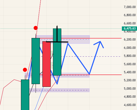 저번에 작성했던 관점이고. 아직 월봉이 마감하지 않은 상태이기 때문에 월봉 몸통이 최소한 6200 매물대 위에서 양봉마감 한다면. 사실상 매물대를 이정도만 만들어주고 상승랠리를 다시 펼치는 걸로 보겠다. 하지만 만약 월봉이 마감할때 윗꼬리를 주면서 6200 매물대 이하에서 마감한다면. 그냥 매물대를 더 만들수 있는 상황이라서 하여간 다음에 관점 쓸 때 어떻게 마감했는지 확인하고 그 때 다시 쪼개들어가서 보도록 하자. 이런경우를 말하는 것.