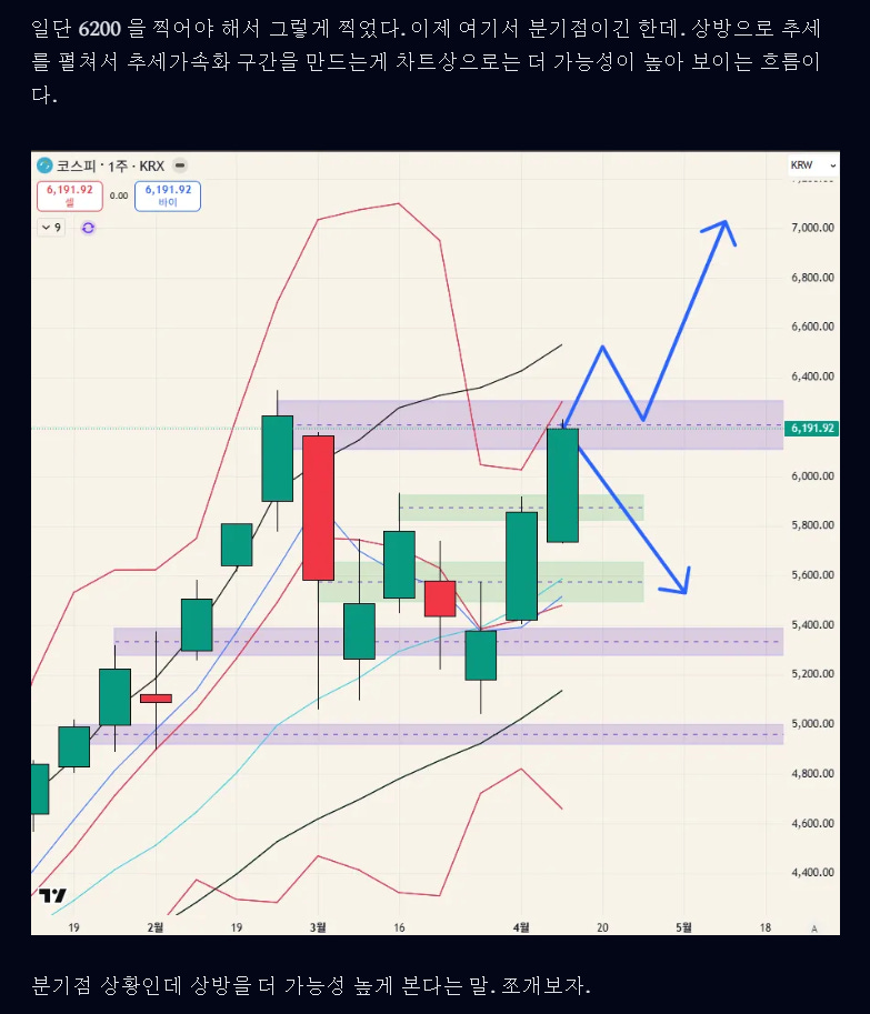 주봉보자. 직전에 작성한 관점에서. 상방 돌파의 가능성을 더 높게 봤었는데.