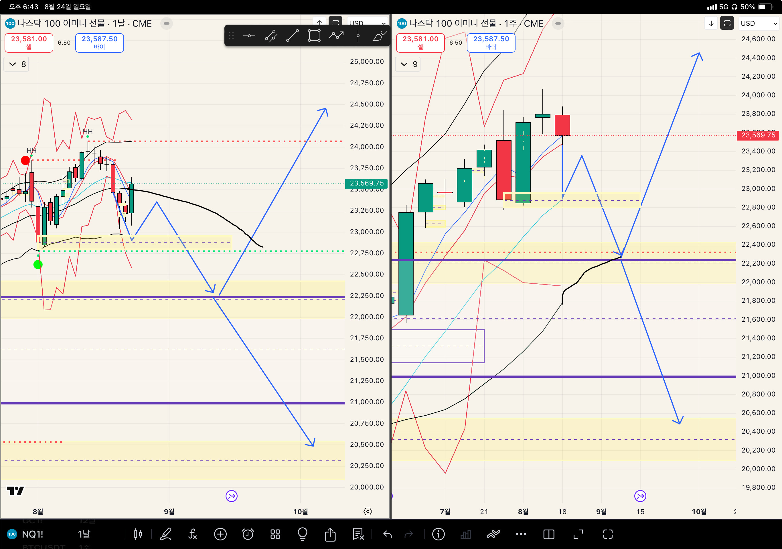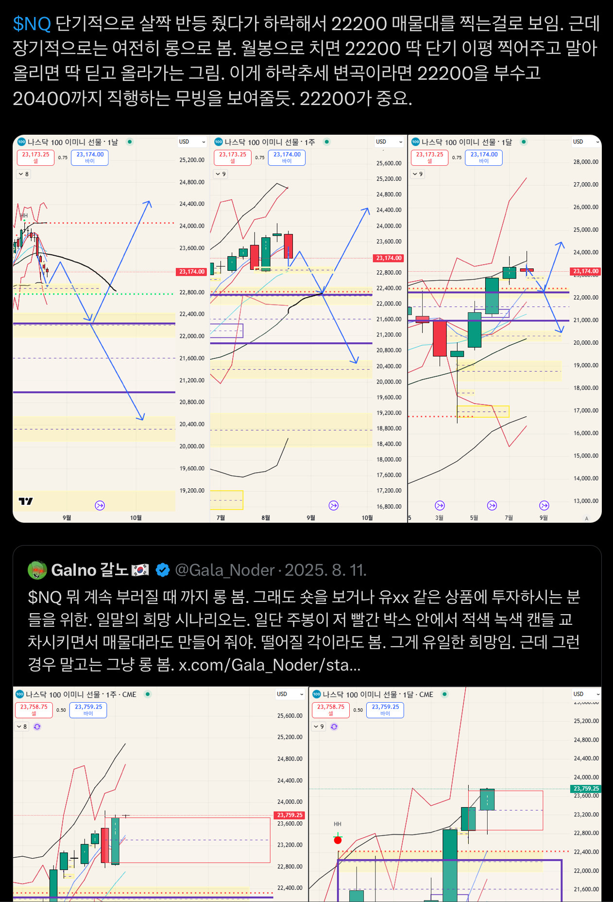 그런데 느낌상 일단 22250 까지 가는 경로를 봄. 그 이후에 그걸 딛고 반등을 해준다면 주봉 월봉급 계속 추세를 이어가는것이 될 것이고. 그게 아니라면 20300 까지 방문하게 되는 하락이 나올 자리.