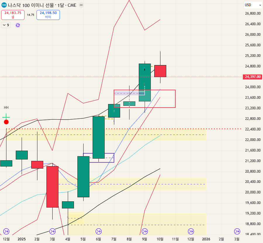 $NQ - 25.10.11$QQQ 포함GalnoOct 11, 2025∙ Paid7Share월봉이다. 아직 월봉 마감하려면 한참 남았다. 일단 현재 월봉 상황은. 월봉 시가가 24800 에서 시작하고. 모든 이평보다 한참 위. 그리고 바로 이전 월봉이 몸통이 꽉찬 양봉으로 단기 매물대를 돌파해준 상황이기 때문에. 지금 하루만의 하락폭이 얼마나 심하든 상관없이. 월봉상 씹 롱 상황이다.월봉상 하방 레인지는 23600 즈음까지 일단 생각해 두는게 맞다. 저기까진 하방으로 빠질 수 있다. 하지만 저기까지 빠져서 밑꼬리 만들어주고.This post is for paid subscribersSubscribeAlready a paid subscriber? Sign inPrevious