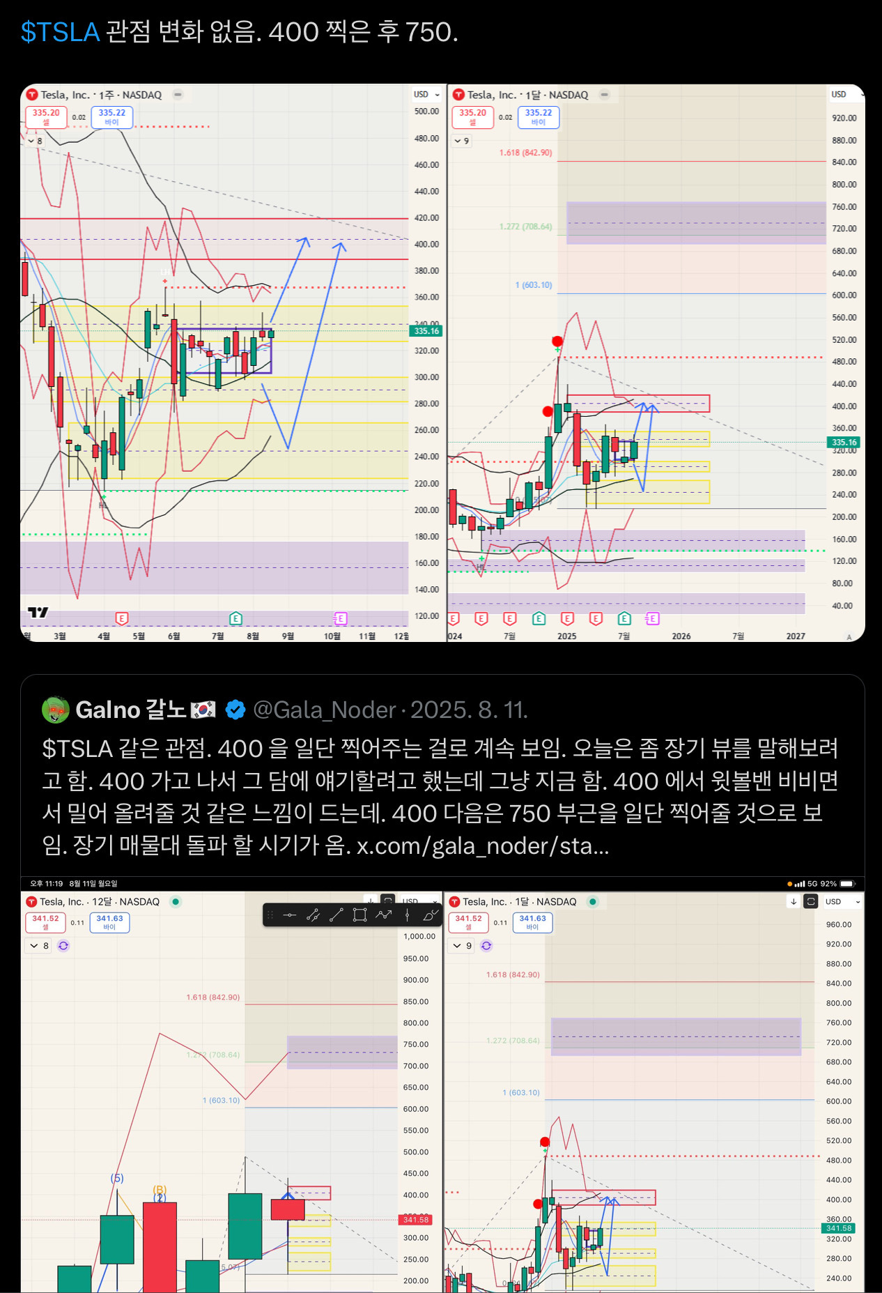 여전히 같은관점임. 테슬라는 일단 400을 가게 될거임. 그리고 테슬라 역시 이더리움처럼 기나긴 장기 매물대를 돌파하고 새로운 영역으로 가격이 이동할 가능성이 높다고 봄.