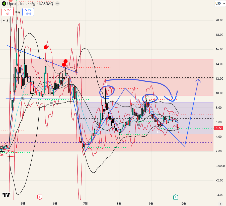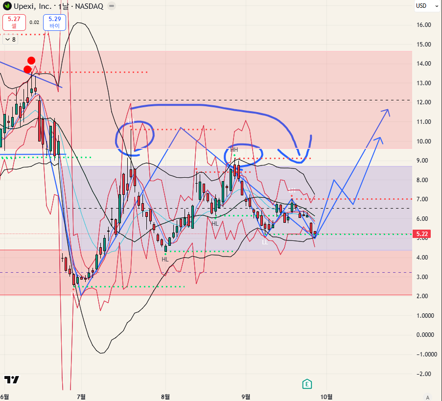 12달러 매물대를 낭낭하게 쌓아줬었는데. 거기 근처 갈 때 마다 리젝당하는걸 보면. 일단 3달러 매물대를 한번더 들러주고 반등이 나와야 더블바텀 형성하면서 다시 12달러 매물대로 들어가주는 그림이 보임. 그리고 현재 매물을 쌓아준 6달러 매물대의 무빙은 보라색으로 칠해놓은게 일봉갭임. 그 일봉갭을 계속 다 메꿔주면서 소화시키고 있는 것.
