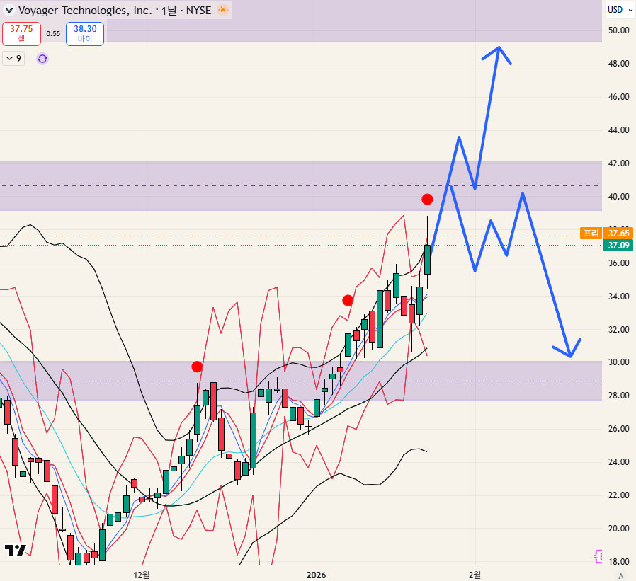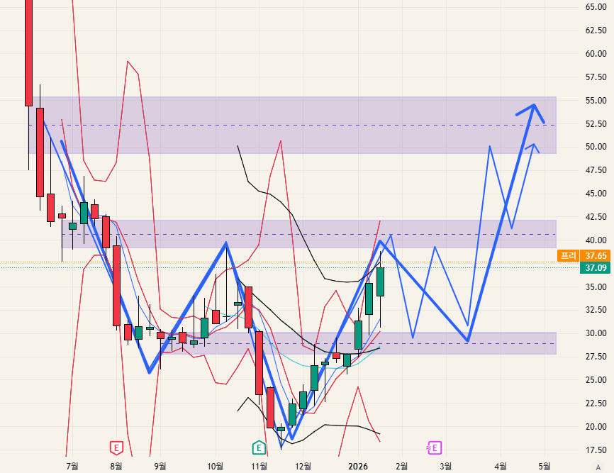 하지만 일봉상으로는 상당히 추세가 쎄서 마치 바로 40 매물대를 뚫어줄 듯한 모양새를 하고 있어서. 어떻게 될지는 알 수 없지만. 포지션이 없다면 30 ~ 40 매물대를 와리가리 치는걸 기다리면서 체크리스트 정도에 올려놓고 관찰하면 좋을듯.