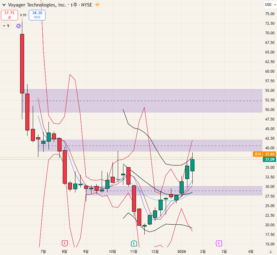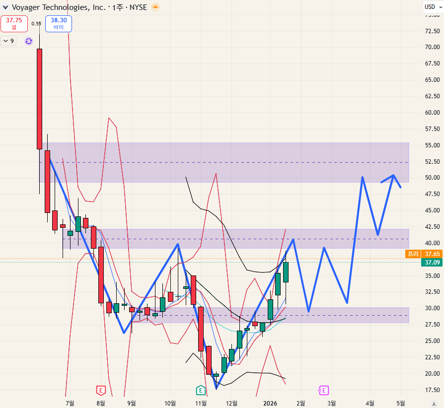 상장된지 얼마 안되서 주봉→일봉만 보면 될듯. 주봉상 이러한 주요 매물대들이 있고 현재 40 매물대가 중요한 천장으로 작용하고 있음.