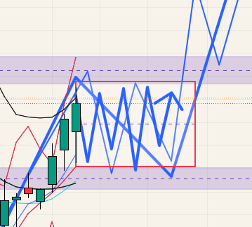 이러한 흐름을 주요한 경로로 보고 있으며. 그 이유는 현재 이평의 꼬임이 시작되고 꼬였다가 다시 정배열을 펼쳐주면서 추세를 분출하게 되면 딱 예쁜 역헤숄 형태로 크게 돌려세우는 흐름을 보여주게됨.