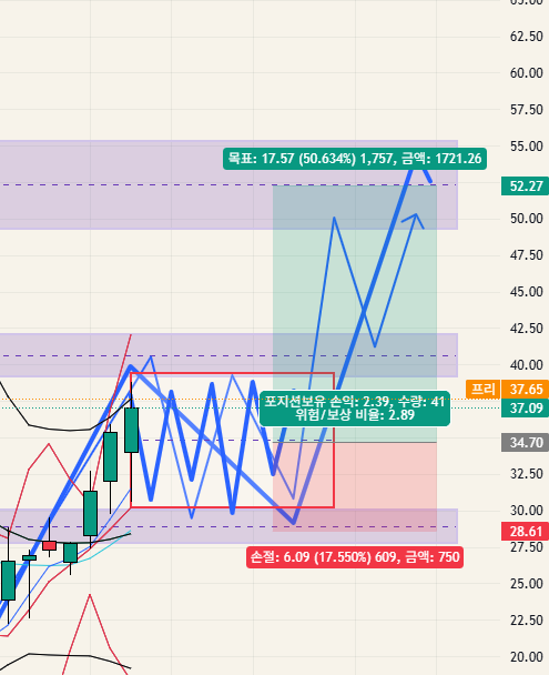 만약 40 매물대를 뚫고 그 위에서 논다면. 거기서 어떻게 무빙을 치는지 주봉 캔들 2~3개 정도 만들어지고 팔로업 할 생각.
