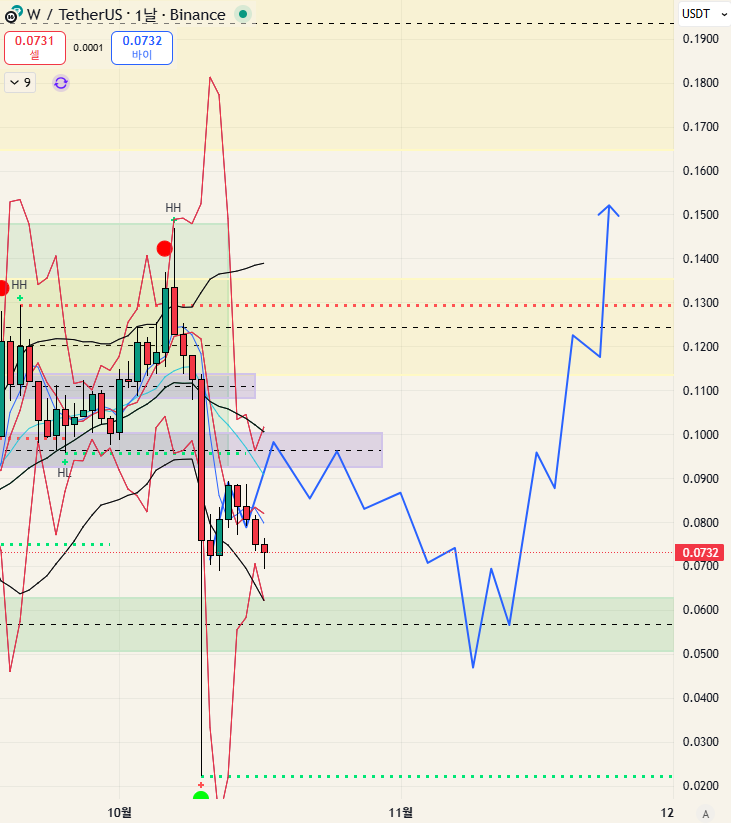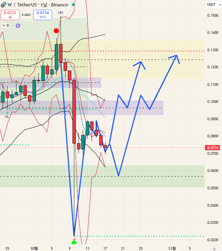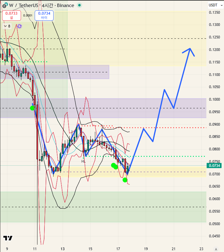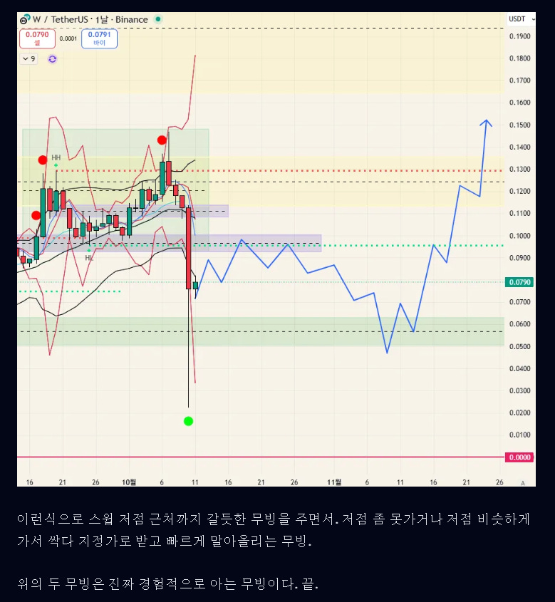 단기적으로는 아예 단기 매물대인 0.07 을 딛고 올라가면 더 베스트다. 하락 시나리오와 시계열이 길어지는 시나리오는. 바로 이전 관점글에 자세히 적어놨으니 그걸 참고. 끝.